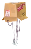 Zamiast głowy ma pudło z napisami "Fragile". Ma cztery stopy a na nich białe buty.
