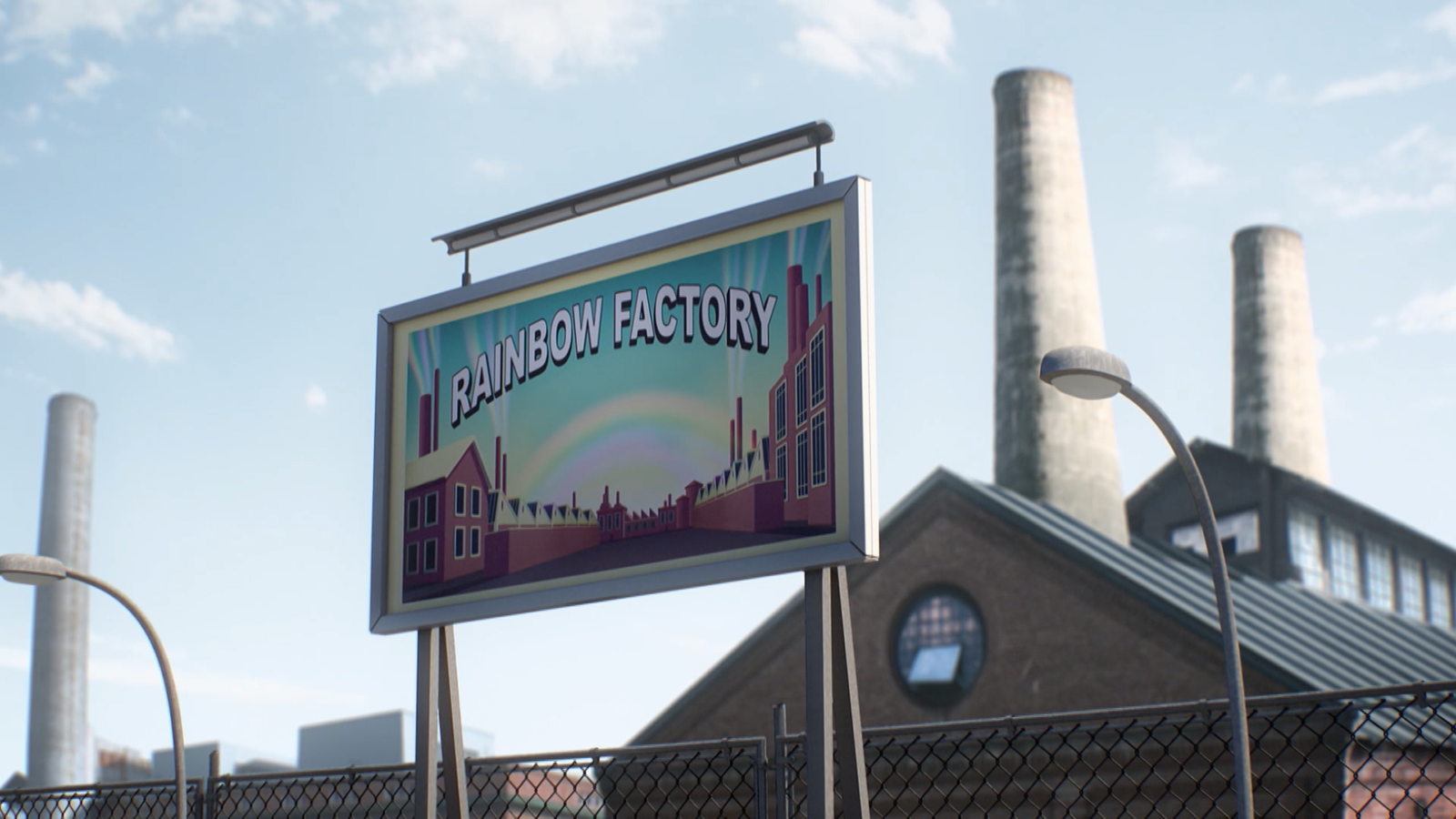 The main industrial area of the factory is situated in a large building with white concrete brick walls. Imprinted on a wall looking over the factory are the words "Elmore Rainbows" in tall, black lettering. Bellow, a small sign with the distinctive trefoil radiation symbol can be seen. In the manufacturing process, after each colour is separately brewed in a multitude of pipes, they are squeezed out into tubes, cut, and packaged. The assembly line on which this process takes place is staffed mainly by the construction men who are closely monitored under the watchful eye of an array of security cameras, six of which can be seen in a small section of wall in "The Factory."