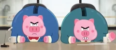 The Rainbow Factory shareholders are two piggy banks. Very similar in appearance, their skin is a pale pink. The minor differences that distinguish them include the he pig on the left having a blue suit jacket, while the one on the right has a turquoise suit. Their white dress shirts are complemented with a red bow tie for the pig on the left, while the one on the right wears a red neck tie. The only noticeable physical characteristic that differs from the two are the shapes of their snouts, a rectangle and a circle.