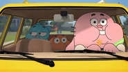 - [Darwin sneezes, flipping the car over. He, Gumball, and Anais are seen sitting upside down]