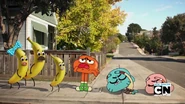 - [Gumball and Anais get down, and take cover. Darwin sneezes at the Bananas. The next scene shows the bananas landing in China]