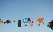 - [Darwin sneezes down, causing him, Anais, and Gumball to float in the sky along with other objects. After a while, they fall down. Gumball faceplants]