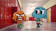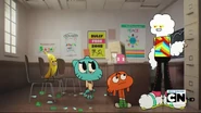 Meanwhile, Gumball and Darwin come across the classroom and witness the state that Joe left it in. Amidst the disorder is Darwin's torn homework. With no other suspect but Banana Joe, Darwin lividly breaks into his locker and begins biting his books and destroy his other possessions. Upon discovering an antique fountain pen, he begins to fiercely chew on it. Mr. Small's voice then speaks over the intercom and calls both of them to his office.