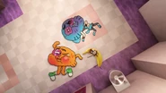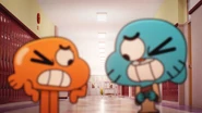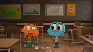 - [Cut to Gumball and Darwin in the classroom seeing the note on the floor, the spilt glitter, Gumball's destroyed desk, and Darwin's ripped homework. Darwin is frozen in shock]