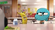 - [In the classroom, Gumball is puncturing the glue tube with a pencil]