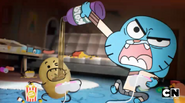 - [Idaho walks inside the house and loud music can be heard then Idaho gasps as he sees Gumball laughing maniacally and filling his mouth with whipped cream then eating some french fries then opens a soda bottle and pours soda all over himself while playing video games and listening to loud music, Idaho walks in the living room and Gumball stops laughing]
