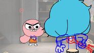 - [Gumball holds his hand behind his back as if hiding a gun. He then holds it up and looks at it hesitantly.]