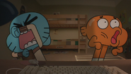 Darwin decides to appeal to the internet's sympathy by singing a song, despite Gumball telling him how heartless the Internet is. When the video is uploaded, however, the Internet has tampered with it and the new video is now near unintelligible. Furious, Gumball challenges the internet and states that he will "go cyber-warrior on the internet's butt." Stripping his clothes, he attempts to upload himself via the scanner, but fails after Darwin is traumatized when he sees Gumball naked on the computer screen. They decide to confront the Internet in the physical world and find its address on the computer.