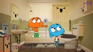 - [Darwin calms down, while Gumball is on his guard. The lights fluctuate, and turns green]
