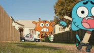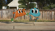 - [Gumball runs, and jumps over to the sidewalk, leaving Darwin behind]