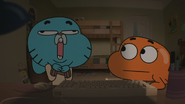 - [The door of his room explodes, and he screams. Gumball and Darwin show up]