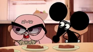 - [Louie cooks some meat, and Gumball eats it. He spits it out]