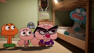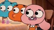 Later that night, Gumball is sleeping, only to be woken and see the terrifying makeup-covered face of Granny Jojo. At first, he thinks it is a nightmare until Darwin and Anais tell him that they helped her get ready for her date, and then he screams. Anais agrees with him, and explains that it was the best they could give her on short notice. The kids then make remarks about how they could improve her already repulsive looks until she tells them to stop and help her reach her date. Gumball does not want to get between her and his father, but then she starts describing how she loves Louie, so Gumball begs her to stop grossing him out and agrees to help her.