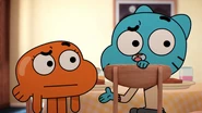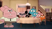 - [Gumball, Darwin, and out two man-off contestants are sitting around the living room table.]