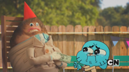 Gumball grows exhausted after running so much, so he and Darwin trade each other's legs for a brief time. They then come upon Sussie's house, where her birthday party is being hosted. They attempt to sneak past, but are inopportunely caught by Sussie. Awkwardly, they are invited and forced to hang out with her family. Gumball tries to excuse himself and Darwin, but Sussie's father bribes him into staying for $1,000. Darwin then calls Anais, asking her if they could hang out next time. He notices that she is pretty disappointed, so he has to talk Gumball out of the party. Gumball reluctantly lets go of the money.
